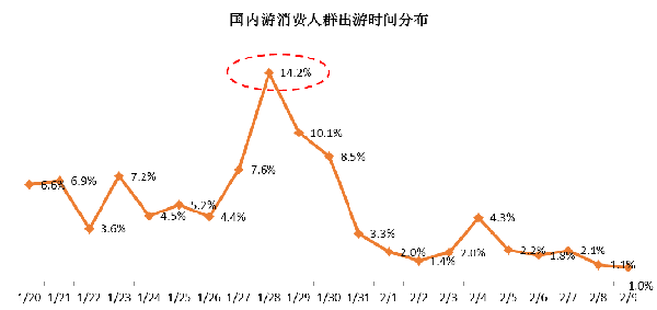 出游時(shí)間方面,春節(jié)國(guó)內(nèi)長(zhǎng)線游者選擇節(jié)前錯(cuò)峰游的占比38.3%,春節(jié)黃金周期間出游的占比47.2%,1月28日(正月初一)達(dá)到客流峰值,選擇節(jié)后錯(cuò)峰出游的僅占比14.5%。