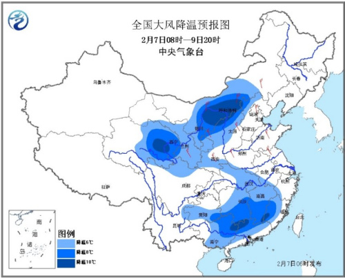 據(jù)中央氣象臺網(wǎng)站消息,2月7日06時繼續(xù)發(fā)布寒潮藍(lán)色預(yù)警:預(yù)計,受寒潮影響,7日至9日,我國中東部大部地區(qū)自北向南將先后出現(xiàn)大范圍大風(fēng)降溫和雨雪天氣,平均氣溫將普遍下降4℃以上,其中,青海東部、陜西北部、內(nèi)蒙古中部、山西北部、貴州東南部、湖南中南部、江西中南部、福建西部、廣西北部和廣東北部等地氣溫將下降8℃以上,局地超過10℃。長江以北地區(qū)并伴有4~6級偏北風(fēng),東部和南部海區(qū)風(fēng)力有7~9級。