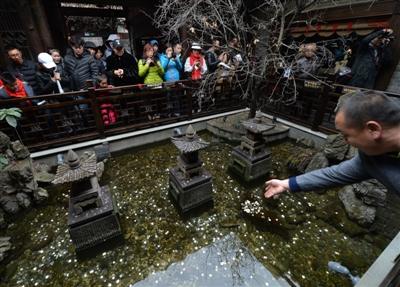 中午時分,記者又一次仔細觀察了水池,在游人拋投硬幣時,確實有一兩條金色的觀賞魚在石縫處游動著。在木制欄桿四周,正貼著“禁止倚靠欄桿”、“禁止投幣”等字樣。“春節(jié)游客爆滿,水池是從寬巷子到窄巷子的必經之道,加上很多人在拋硬幣,頓時人滿為患。我們只好打印了幾張?zhí)嵝褟堎N起來?!鞭k公室工作人員還表示,“等春節(jié)游客潮稍微退卻,天氣回暖,我們就要派人下水打撈這些硬幣,用于景點建設。”