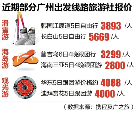 數(shù)據(jù)顯示,越來越多的出境游線路和國內游價格相差無幾,不少線路更是“平到笑”。比如,羊城晚報記者根據(jù)攜程及廣之旅報價發(fā)現(xiàn),近期一些廣州出發(fā)到韓國滑雪自由行5日價格為3893元,而到長白山滑雪5日行的價格為5669元;廣州到三亞與到泰國普吉島海島游自由行價格均為3000元左右;廣州到迪拜5日賞花游跟團游4000元,廣州到華東5日跟團游4088元;廣州到越南、柬埔寨出境線路跟團游普遍只需兩三千元,低過不少國內游線路。