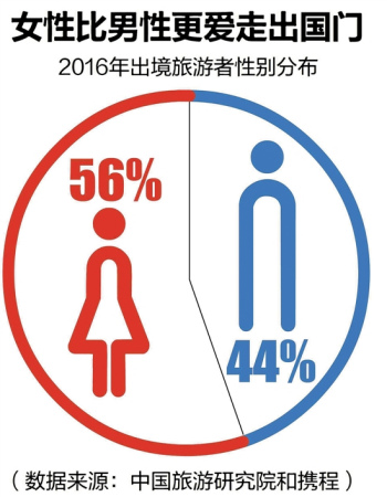 而在性別上,女性比男性更愛走出國門。中國旅游研究院和攜程的報告顯示,根據(jù)在線出境游的性別、年齡統(tǒng)計,2016年出境旅游者中,56%是女性,44%是男性,女性比例高12個百分點。