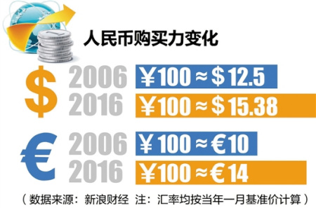 出境游人數(shù)11年增長2.5倍,與中國人均GDP增速不謀而合。而人民幣匯率從2006年100元人民幣約兌換10歐元,上升至2016年約兌換14歐元,上升近50%。人民幣兌美元也從2006年的100元人民幣約兌換12.5美元,上升至2016年約兌換15.38美元,上升近25%。人民幣更值錢、錢袋子更鼓讓國人出境游更有底氣。