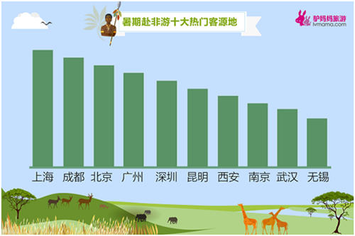 驢媽媽旅游網(wǎng)(以下簡稱,驢媽媽)數(shù)據(jù)顯示,今年暑期赴非游預訂人次同比上漲近2倍,赴非旅游熱情持續(xù)高漲,8月中上旬將迎來暑期出游最高峰。其中,追求獨特旅游體驗且有一定經(jīng)濟實力的25-40歲游客是赴非洲旅游的主力客群,該年齡段占比超7成;國內(nèi)城市中,上海、成都、北京、廣州、深圳、昆明、西安、南京、武漢、無錫成為十大熱門客源地。