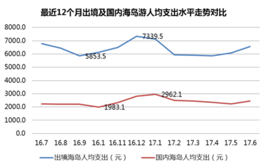 《報告》提供的同程旅游海島游消費數(shù)據(jù)顯示,最近一年(2016年7月至2017年6月)出境海島游消費人群用于購買旅游產(chǎn)品(線路、交通、住宿等,不含購物消費)的人均支出為6340.6元,國內(nèi)海島游人均支出為2368.9元。從時間軸來看,出境海島游和國內(nèi)海島游的人均支出水平明顯與出游客流的季節(jié)呈現(xiàn)出同步變化趨勢,出境海島游旺季人均支出最高可達7339.5元,國內(nèi)海島游旺季人均支出最高可達2962.1元。