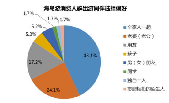 出游同伴選擇偏好分析可從消費人群社會關(guān)系的角度間接看到當(dāng)前海島游的客群結(jié)構(gòu)?!秷蟾妗坊谕搪糜魏u游用戶數(shù)據(jù)分析顯示,43.1%的人選擇全家人一起出游,24.1%的人選擇與伴侶一起出游。結(jié)合人群年齡分布數(shù)據(jù)來看,家庭、新婚夫婦、情侶、親子是海島游的核心客群。