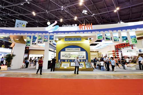 忻州展廳以“欣欣向榮·心靈之舟”為主題布展,展位在設(shè)計上將“五臺山”藍天白云與佛教建筑形成的獨特景色融為一體,從立體空間結(jié)構(gòu)、色彩氛圍渲染和建筑元素搭配等幾個方面著手,設(shè)計出獨具忻州特色的“佛教圣境”展廳。(本報記者 馮曉磊 攝影報道)