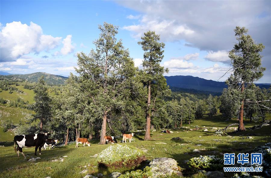 這是6月21日拍攝的新疆阿勒泰地區(qū)哈巴河縣的牧場(chǎng)風(fēng)光。新華社記者 沙達(dá)提 攝