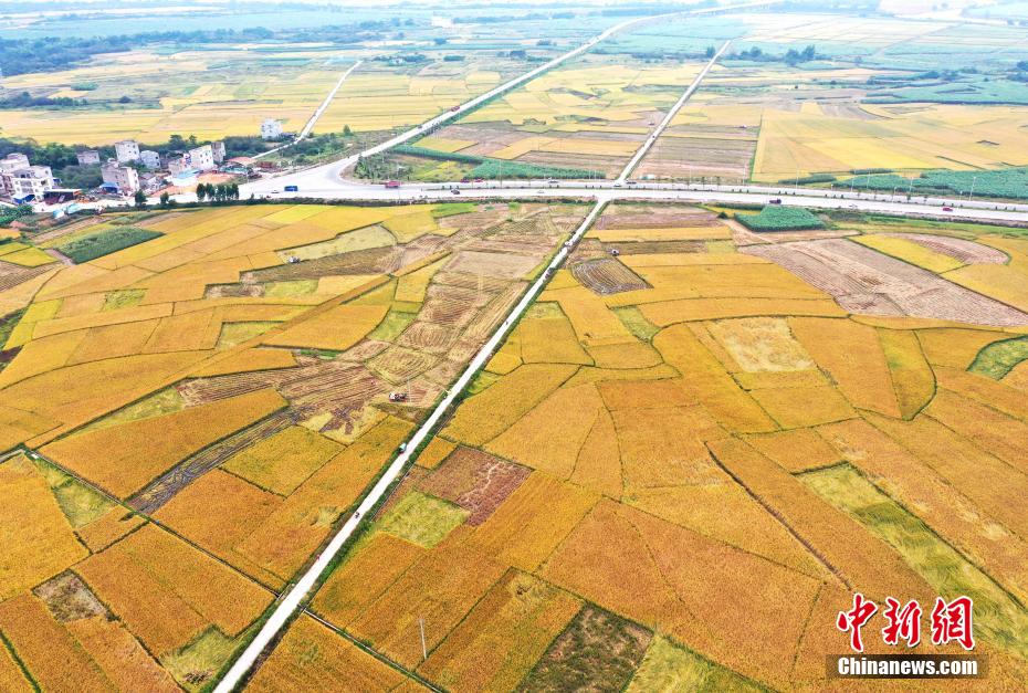 金秋時節(jié),稻谷飄香。行走在廣西鄉(xiāng)村田間地頭,金黃的稻浪隨風(fēng)起伏,農(nóng)民忙著收割晚稻,晾曬稻谷,臉上洋溢著豐收的喜悅。在廣西崇左市寧明縣明江鎮(zhèn)岑岳村,從空中俯瞰,金黃的稻谷好似為大地鋪上了一層黃金地毯,構(gòu)成一幅幅美麗的豐收圖景。 周貽剛 攝
