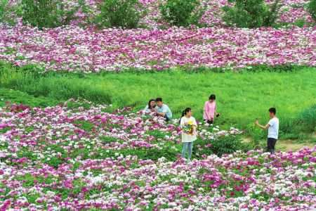 5月2日,游客正在平陸縣太陽(yáng)渡村盛開(kāi)的芍藥花田中賞花游玩。姜樺攝