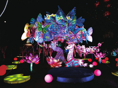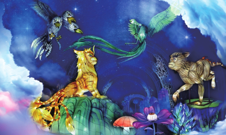 奇幻風(fēng)格的桃花路上,《山海經(jīng)》中的仙山海景和祥瑞神獸也來(lái)助陣。渾身毛發(fā)雪白的九尾狐,三頭六尾名叫鵸的鳥(niǎo)妖、吼聲震天名叫狌狌的犲山獸、立于昆侖山巔遙望東方的陸吾、三首六尾夜半怪笑的鵸鵌、悠然自得的麋鹿、充滿神秘色彩的青鸞、抬腿準(zhǔn)備騰云的飛馬……置身其中,仿佛斗轉(zhuǎn)星移,滄海桑田。地面的點(diǎn)點(diǎn)星光,營(yíng)造出神秘夢(mèng)幻的奇趣山海世界。