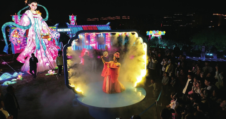 在百花的傳說(shuō)中,十二月令花神的傳說(shuō)最令人神往。在桃花島上,梅花、杏花、桃花、牡丹、石榴、蓮花、蜀葵、桂花、菊花、木芙蓉、山茶、水仙,各路花神身著華服,在所屬花燈前翩翩起舞,燈光人影交織,盡顯浪漫?!笆ㄉ瘛泵客矸謺r(shí)段在桃花云臺(tái),跳起如云似幻的祈福舞,笑容明媚,面若桃紅,傾倒眾人。無(wú)人機(jī)組集合成孔明燈形狀,載著每個(gè)人最虔誠(chéng)的心愿緩緩升空?!笆ㄉ瘛彪S即走下“神臺(tái)”,出沒(méi)在各個(gè)角落,讓整個(gè)桃花島亦真亦幻。穿行其中,與“花神”擦肩而過(guò),仿佛穿越時(shí)空,進(jìn)入神話世界。