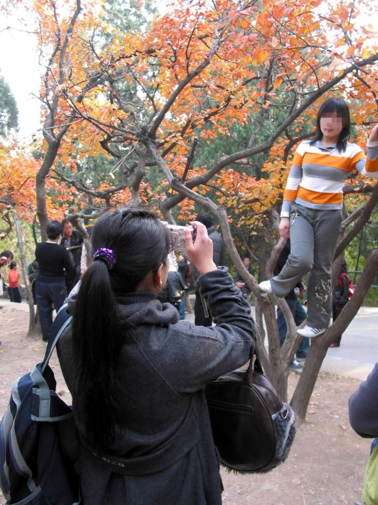2007年11月4日,不少游客來(lái)到北京香山觀賞紅葉,一名游客爬上樹(shù)與紅葉合影。新華社記者孫洪磊攝