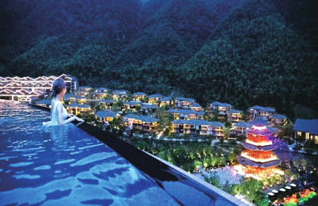 徜徉泳池,可觀落日余暉、滿天星辰,一邊是古風(fēng)古韻的漢唐建筑,一邊是綠意正濃的山林竹間;一半是封存塵世的自然風(fēng)景,一半是觸手可及的浪漫風(fēng)情。俯瞰葛仙村,盡享古韻之美。傍晚,落日余暉均勻曬在水面上,散為金光,而晚霞,也幻成異樣的色彩,一層層的光和色,相互交融著,“落霞與孤鶩齊飛,秋水共長天一色”的意境就是如此吧。夜里輕柔的晚風(fēng),拂過泳池,水波粼粼,被周邊的燈光映襯得就像無數(shù)的水晶鋪設(shè)在水面上,星空與池底交相呼應(yīng),帶來無盡的浪漫氣息。
