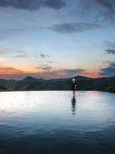 白天,游人可以搭乘索道登上葛仙山,行在山中,可見清泉瑩然,苔蘚盈階、云海翻騰,可聽泉水響動,天色如夢變幻。葛仙山的翠竹、樹木極多,是一道天然的屏障,趕在落日之前,快步來到葛仙村無邊泳池,赴一場“橘色云朵+藍(lán)色池水”的浪漫。