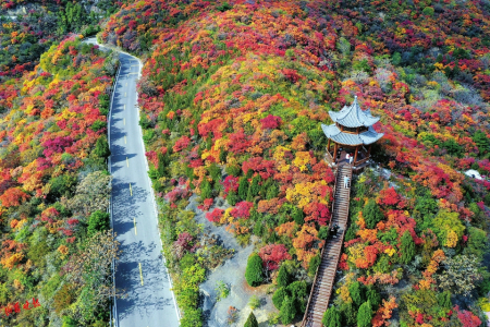 龍山、太山景區(qū)位于風(fēng)光秀麗、重巒疊翠的太原西山,東臨晉陽古城遺址,西接天龍山風(fēng)景區(qū),盤繞在崇山峻嶺之中,是太原西山文化帶的璀璨明珠,集豐富的歷史遺存與優(yōu)美的自然景觀為一體。每年深秋,秋葉臨霜而紅,層林盡染,漫山紅遍。聞名遐邇的“西山紅葉”正逢盛季,萬畝紅葉流丹似火。龍山、太山紅葉,是太原西山地區(qū)分布面積最大、最為集中的紅葉觀賞地。游客順著山勢(shì)拾級(jí)而上,山巒環(huán)抱的山坳里、溝谷中、山脊上,一團(tuán)團(tuán)一簇簇,或紅或橘,或黃或綠,仿佛置身大自然的畫盤之上。