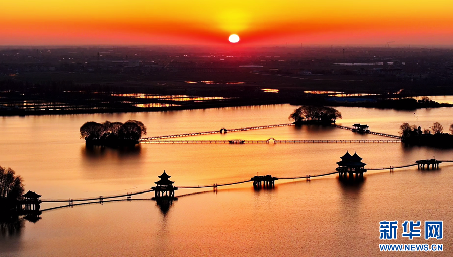 近日,在安徽省潁上縣八里河風景區(qū),隨著紅日冉冉升起,晨曦映照在水面上,水光瀲滟,交相輝映,宛如油畫一般,盡顯光影之美。新華網(wǎng)發(fā)(徐紅梅 攝)