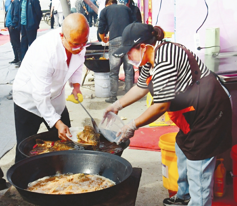 首屆熬魚美食節(jié)匯聚了代縣碗托、老咸菜、豆腐干等當(dāng)?shù)亍凹亦l(xiāng)味”,12家熬魚商戶更是集體亮相,現(xiàn)場烹飪銷售。賈狗狗有著近40年的熬魚經(jīng)驗,今年備貨比往年更足、更早。