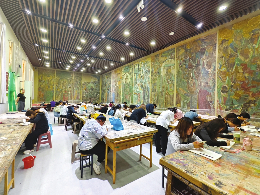 學(xué)生在永樂宮壁畫臨摹室臨摹壁畫。周明飛攝