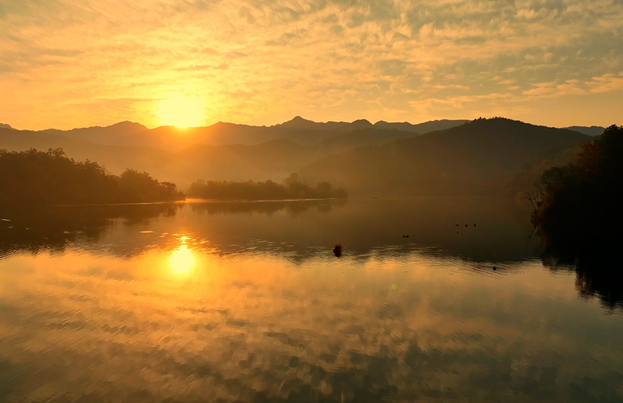 10月29日,在安徽省池州市的秋浦河畔,朝霞與水面相映成趣,泛舟秋浦河仿佛置身仙境。秋浦河是長(zhǎng)江支流,風(fēng)光秀美,因唐代詩(shī)人李白的《秋浦歌十七首》等詩(shī)作而聞名。新華網(wǎng)發(fā)(王帆 攝)