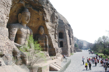 大同云岡石窟依山開鑿,是中外文化、中國(guó)少數(shù)民族文化和中原文化、佛教藝術(shù)與石刻藝術(shù)相融合的一座文化藝術(shù)寶庫(kù)。