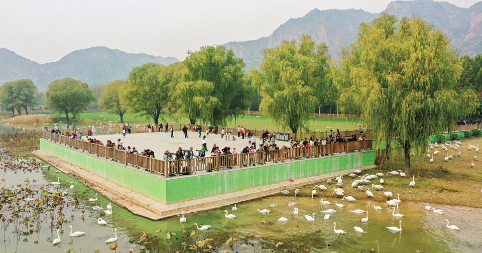 11月10日,運城市平陸縣三灣黃河濕地,成群野生大天鵝在這里棲息越冬,吸引眾多游客前來觀賞,展現(xiàn)出一幅人與自然和諧相處的美麗生態(tài)畫卷。近年來,平陸縣持續(xù)推進黃河沿岸濕地生態(tài)治理與環(huán)境修復,拉動當?shù)剞r文旅產業(yè)深度融合,助推縣域經(jīng)濟高質量發(fā)展。