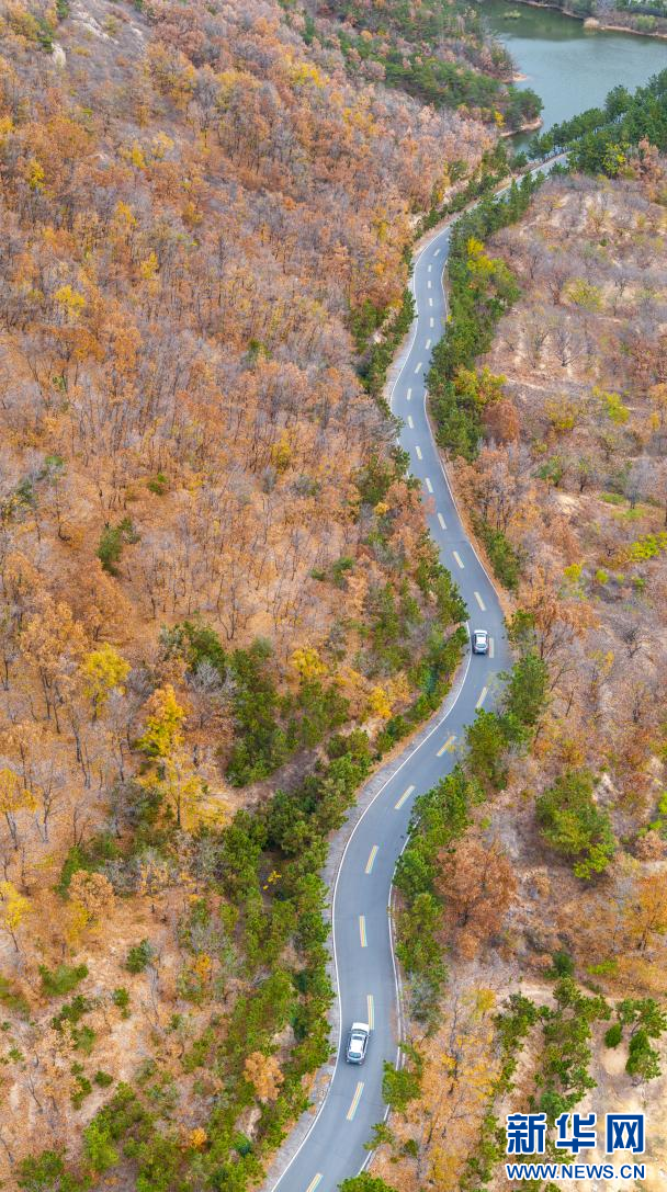 車輛行駛在九仙山景區(qū)的山路上(無人機(jī)照片)。新華網(wǎng)發(fā)(單英 攝)