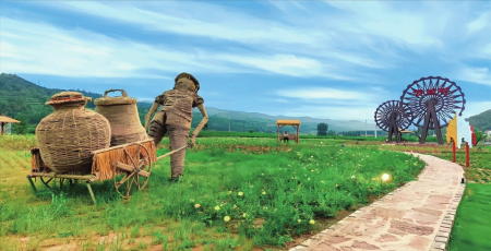 游走村內(nèi),瀟河源文化主題公園里有不少新穎物件:風(fēng)動(dòng)的鐵藝風(fēng)車,像向日葵一般對著太陽開合;可以鍛煉用的水槍,需要用力向下壓幾下才能噴出很遠(yuǎn)的水,用來澆灌花叢;還有會唱歌的“石頭”、用木條編制成的敲鑼大兔子……村內(nèi)樹木叢生,百草豐茂,綠葉水光交織,讓人心曠神怡,流連忘返。