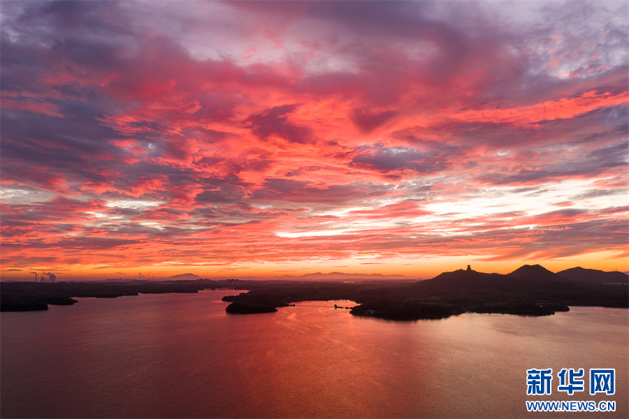 近日,安徽省池州市平天湖上空出現(xiàn)絕美朝霞景觀。新華網(wǎng)發(fā)(程爽 攝)