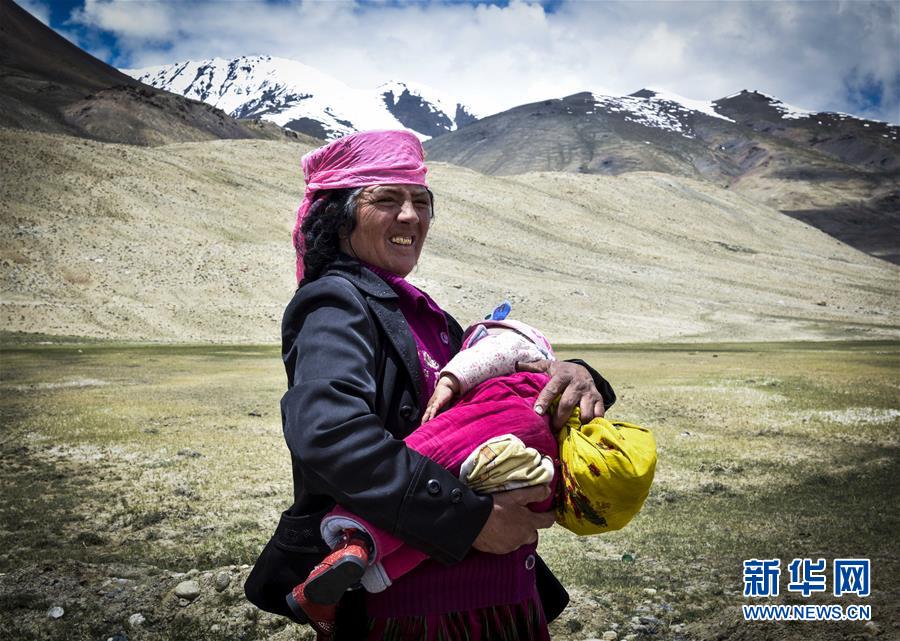 在帕米爾高原瓦罕走廊,一位牧民抱著孫子去親戚家串門(6月4日攝)。6月的帕米爾高原風(fēng)光旖旎,吸引國內(nèi)外大量游客前來領(lǐng)略它的神韻。 新華社記者 趙戈 攝