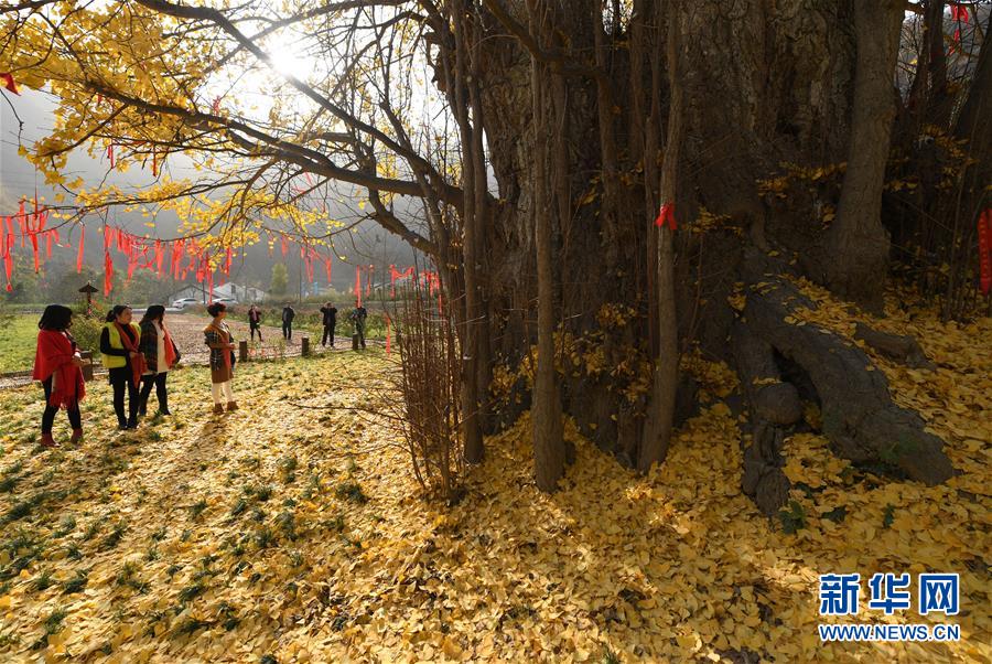 11月19日,游客在留壩縣玉皇廟鎮(zhèn)參觀千年銀杏樹。初冬時(shí)節(jié),在秦嶺深處的陜西省留壩縣玉皇廟鎮(zhèn)石窯壩村,一棵千年古銀杏樹的落葉宛如金色地毯,甚為壯觀。據(jù)當(dāng)?shù)亓謽I(yè)部門介紹,該樹胸徑為4.45米,現(xiàn)有高度29米。新華社記者 陶明 攝