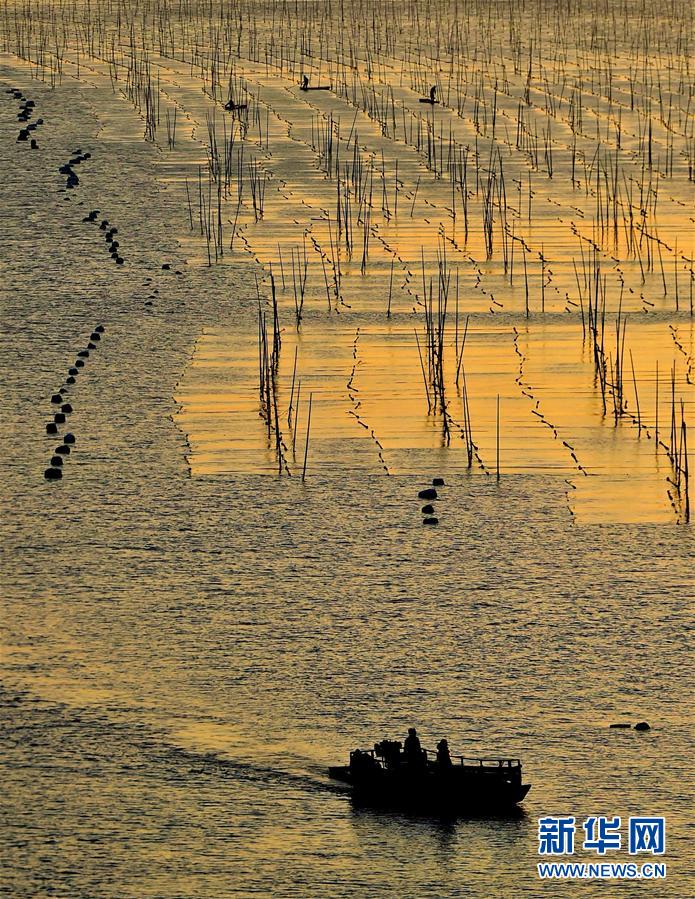 12月9日,夕陽(yáng)西下,一艘漁船穿行在海上紫菜養(yǎng)殖架間。福建省寧德市的霞浦縣以美麗的淺海、灘涂聞名,豐富的旅游資源和人文資源一直是攝影師追逐的靈感所在。 新華社記者魏培全攝