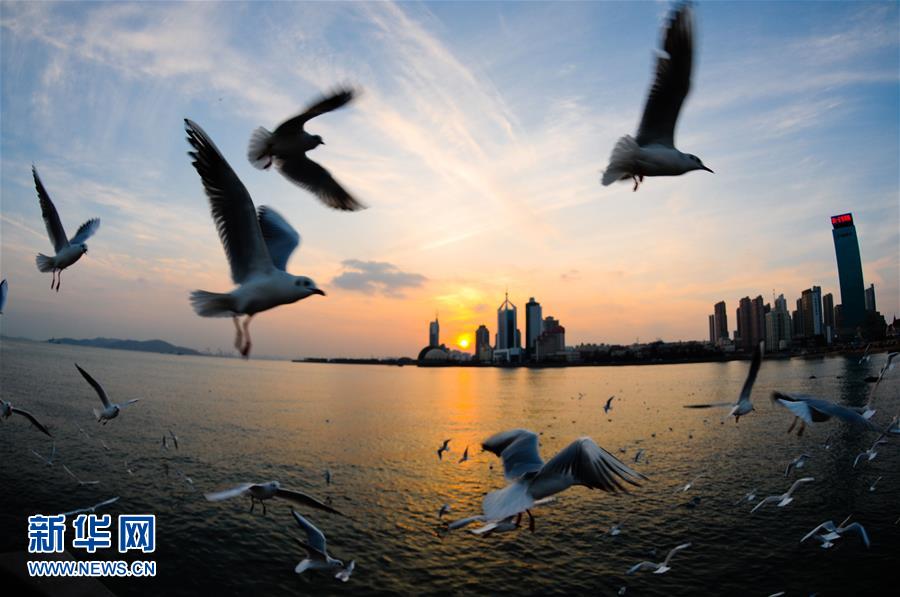 1月10日,水鳥(niǎo)在青島棧橋景區(qū)一帶飛翔。當(dāng)日,山東省青島市天氣晴好,黃昏時(shí)分沿海一帶景色迷人。 新華社發(fā)(王海濱 攝)
