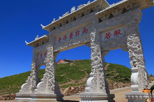 五臺山的南臺名喚錦繡峰,又名仙花山,海拔2485米。整個山勢像一匹駿馬靜臥群山之中。山峰聳峭,孤立挺拔,如果說其他四個臺是連襟而立或裙帶關系的話,南臺則是貌美如花、孤傲冷峻的公主?!肚鍥錾街尽访枋觯骸吧椒迓柷?,煙光凝翠,細草雜花,千巒彌布,猶鋪錦然,故以名焉”。山頂寺院叫普濟寺,內供智慧文殊。