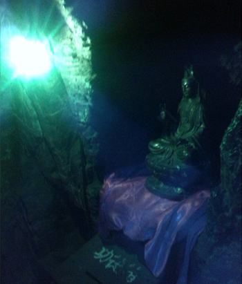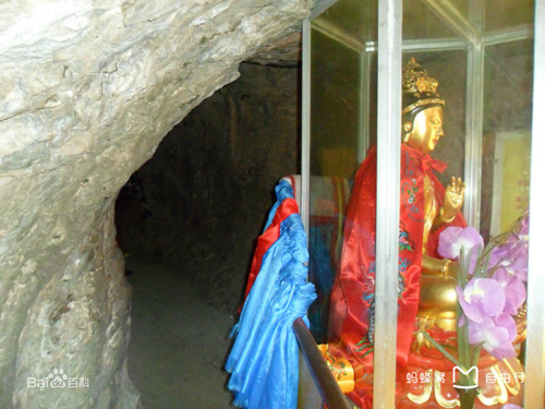 千佛洞,分內外兩洞,外洞大而明,內洞小而幽,中間有一個扁圓形孔穴相通。內洞中,可以容納五至七人。內洞的洞壁上,山巖經(jīng)水溶化,產生許多乳石及石筍,夾有各種色質,猶如人體心肝五臟,洞形又呈葫蘆形狀,后人便稱之為母腹。佛教宣揚進入小洞就是投胎佛母,受其恩育,復出小洞就是洗掉人生一切煩惱,獲得無上歡樂幸福。
