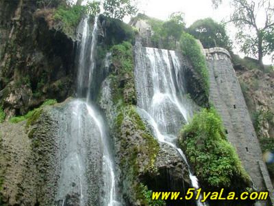 娘子關(guān)瀑布,是澤發(fā)水的源頭,人稱水簾洞,山坡谷中泉眼累累,形成懸泉。瀑布由多股泉水匯流而成,沿懸崖峭壁傾瀉而下,懸空如白練掛在石壁前,形成高達(dá)十幾丈高的飛流?!昂Q邸笔亲畲蟮娜?,泉水翻滾,激起層層浪花,響聲震耳。瀑布旁有“趵突泉”突突噴涌,并有諸多小“趵突泉”相映襯。一股股水流噴吐冒出,浪花紛飛,日夜不息,常年涌流,給娘子關(guān)風(fēng)光增色不少。