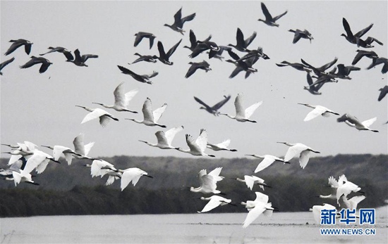 11月29日,候鳥在江西鄱陽湖南磯濕地國家級自然保護區(qū)飛翔。近日,大批南遷候鳥飛抵鄱陽湖棲息越冬。