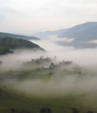 炊煙裊裊的村莊,偷偷地從薄霧里露出惺忪的臉來,時隱時現(xiàn),猶如傳說中的蓬萊仙島。一個個白族村莊沉浸在美輪美奐的仙境之中,整個峽谷布滿著一幅幅精美絕倫的淡墨山水畫??上У氖谴逯械娜藗冞€未品嘗出做神仙的滋味,霧海就隨著江面吹來的西風越升越高,不一會兒,就向羅平山頂飄襲而來。我們幾個觀霧者迅即被淹沒在濃濃的云山霧海中,成了騰云駕霧的神仙了。遺憾的是我們還未過足神仙癮,那些飄蕩在山頂?shù)脑旗F就被熱烈而耀眼的太陽光收回去了,讓我們不得不回到人間,仍去做原來的凡夫俗子。