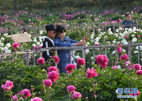 6月2日,游客在和林格爾縣南山旅游景區(qū)觀賞芍藥花。當日,2018內蒙古和林格爾第九屆芍藥文化旅游節(jié)在和林格爾南山旅游景區(qū)開幕。景區(qū)內數百畝芍藥花競相綻放,吸引眾多游客前來觀賞。新華社記者 鄒予 攝