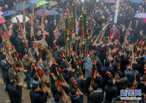 1月14日,人們?cè)趶V西融水苗族自治縣紅水鄉(xiāng)舉行的蘆笙節(jié)上賽蘆笙。新華社記者 陳君清 攝