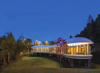 夜色朦朧中,一幢幢造型別致的建筑閃現(xiàn)眼前,或尖頂,或圓頂,點綴山間,乍看之下,如同天幕下支撐起一個個巨大帳篷。這里就是度假區(qū)的核心板塊,黃山關(guān)麓帳篷客酒店。從山下到山頂,別墅或獨棟,或聯(lián)排,根據(jù)地形進行設計,就像從山林中“生長”出來,一條蜿蜒曲折的小路,將它們相互連通。32套別墅以文房四寶中的墨海、紫豪、松煙、云藍命名,雅致中凸顯出一份徽州文化的情調(diào)。