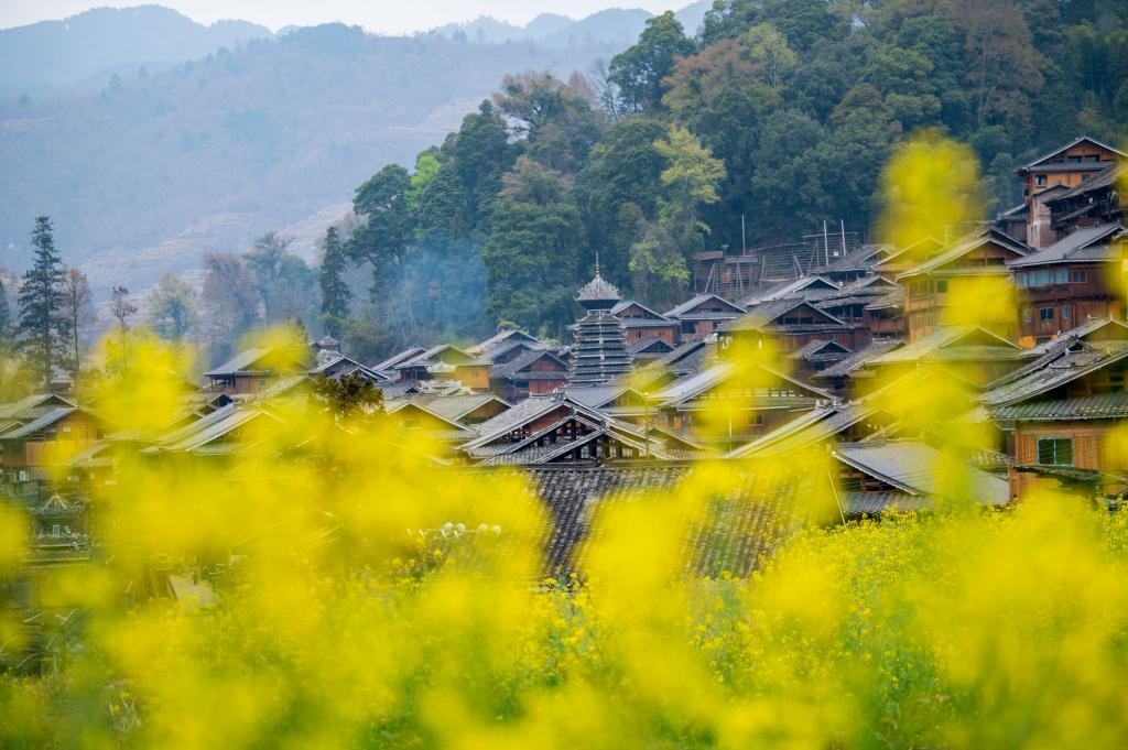 ?? 2024年3月10日,貴州省從江縣高增鄉(xiāng)占里侗寨內(nèi)盛開的油菜花與鼓樓、民居相映成景。CICPHOTO/吳德軍 攝