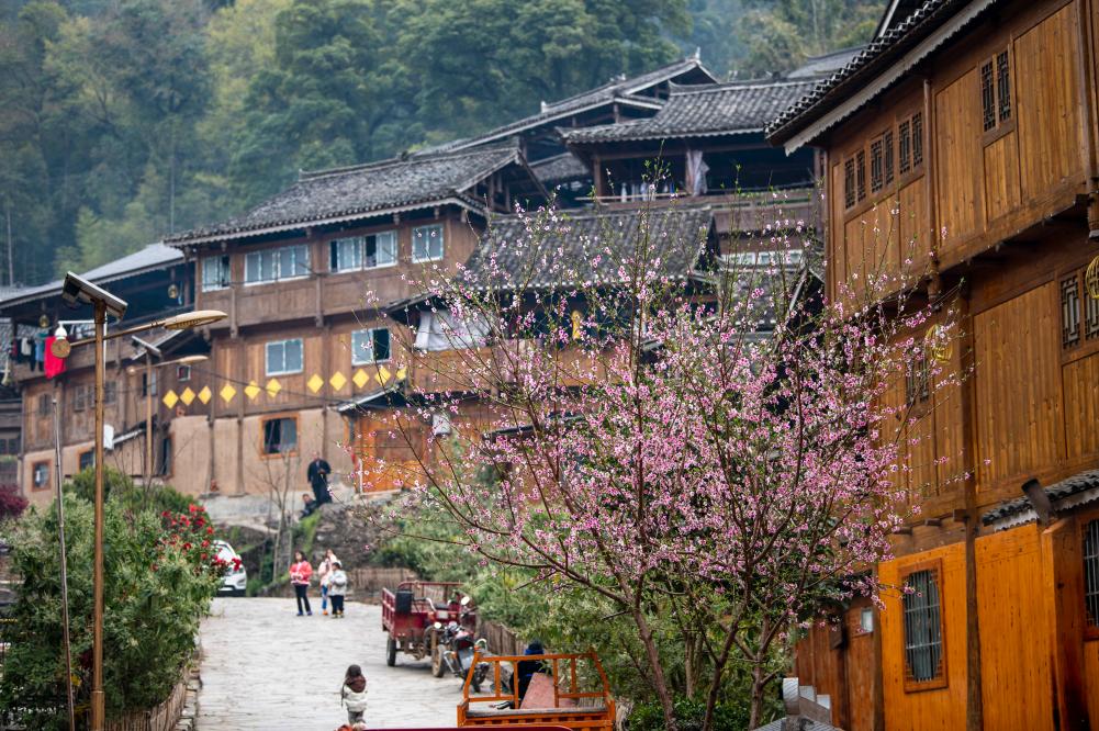 早春時(shí)節(jié),貴州省黔東南苗族侗族自治州從江縣高增鄉(xiāng)占里侗寨內(nèi)鮮花綻放,呈現(xiàn)一派春意盎然的景色,吸引不少游客前來賞花、踏青。