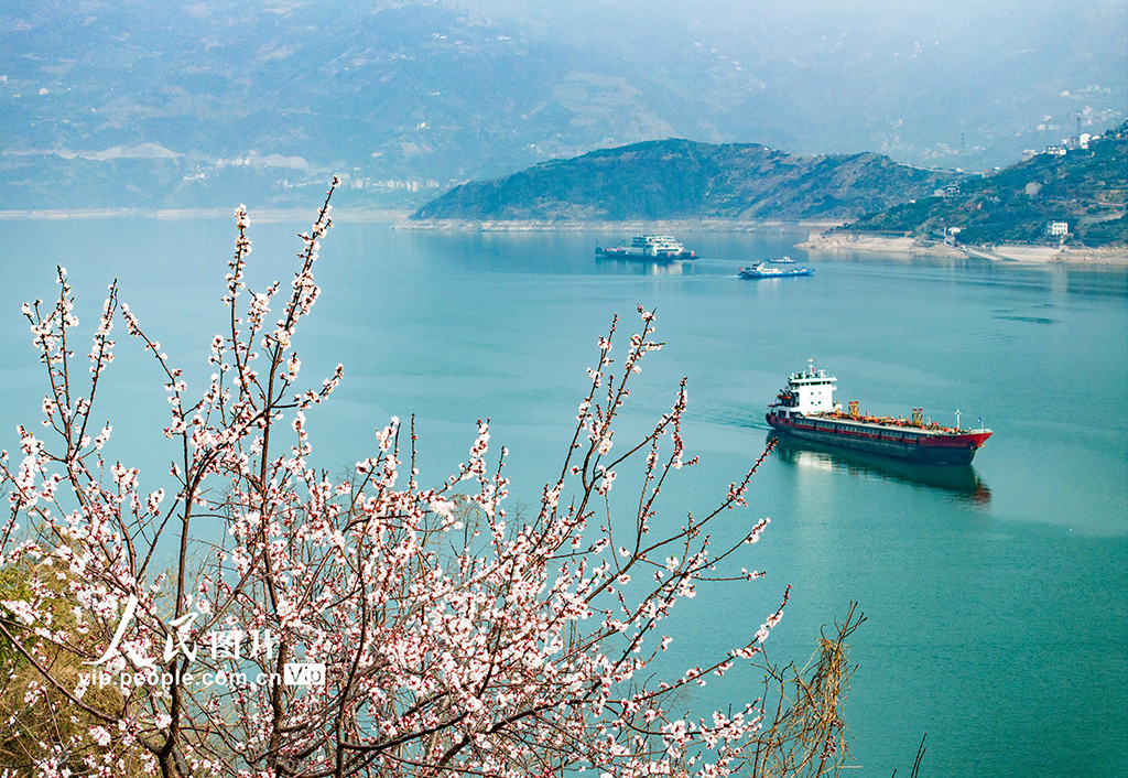 春風送暖,大地回春,位于湖北省宜昌市的長江三峽西陵峽兩岸櫻桃花、杏花相繼開放,生機盎然,船舶航行江面,宛如畫中,美不勝收。吳承忠攝(人民圖片網(wǎng))