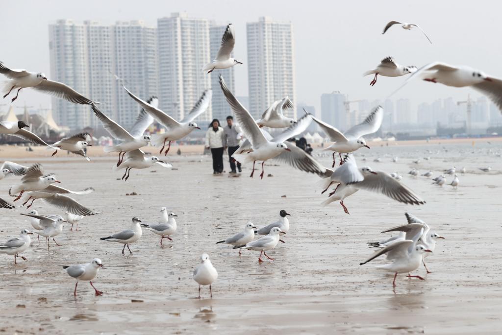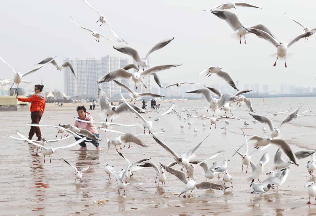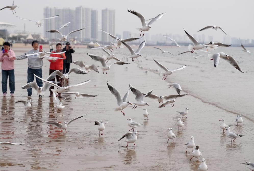 春日和暖,大批海鷗在河北省秦皇島市金夢海灣浴場飛舞、覓食,吸引游客前來觀賞。