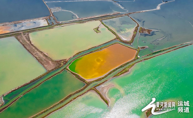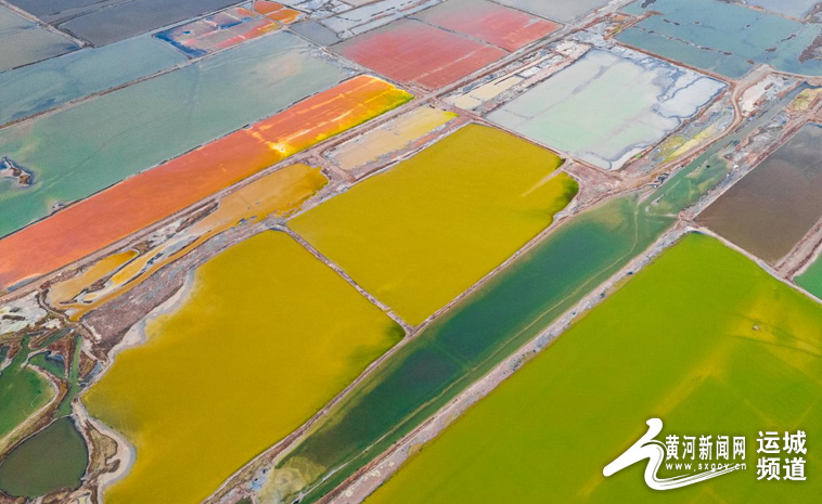 4月14日無人機(jī)拍攝的山西運(yùn)城鹽湖。近日,隨著氣溫不斷升高,山西運(yùn)城鹽湖呈現(xiàn)五彩斑斕的景象,美不勝收。