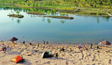 太原市西干渠,市民搭起帳篷喝茶吃燒烤,享受假日時(shí)光。