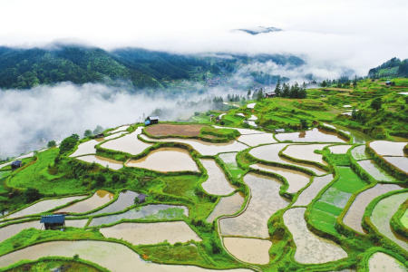 圖為5月19日拍攝的貴州省黎平縣尚重鎮(zhèn)洋洞村梯田(無(wú)人機(jī)照片)。小滿(mǎn)節(jié)氣前,貴州省黔東南苗族侗族自治州黎平縣尚重鎮(zhèn)洋洞村周?chē)奶萏镄钏S盈,一場(chǎng)新雨過(guò)后,云霧繚繞,如詩(shī)如畫(huà)。