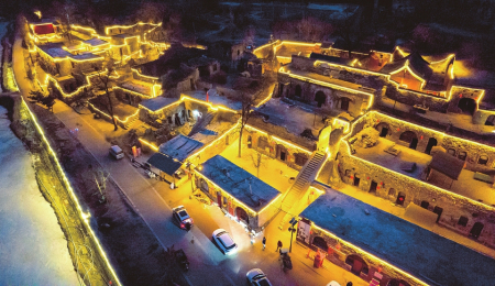 2月15日,太原市店頭村,明亮的“燈帶”勾勒出古村落輪廓,如墜夢(mèng)境,別有韻味,吸引了游客前來(lái)打卡。