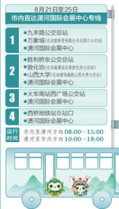太原市將在山西文博會期間開通5條免費公交接駁專線。其中,4條市內(nèi)直達瀟河國際會展中心的專線,分別從九豐路公交總站—萬象城(北向南新晉祠路長興北街口公交站)—瀟河國際會展中心;勝利橋東公交總站—敦化坊(北向南建設北路敦化坊公交站)—山西大學(北向南塢城路山西大學公交站)—瀟河國際會展中心;火車南站西廣場公交站—瀟河國際會展中心;西橋地鐵站B站口—瀟河國際會展中心。運行時間為市內(nèi)至瀟河方向8:00—15:00,瀟河至市內(nèi)方向10:00—18:00。此外,為便于駕車自行前往的市民出行,還開通了1條社會停車場至山西瀟河國際會展中心的免費接駁線路。該線路從先行路瀟河大街口經(jīng)先行路至會展中心往返運行,在智慧南街口、先行路樂商街口停靠,運行時間為9:00—18:00。