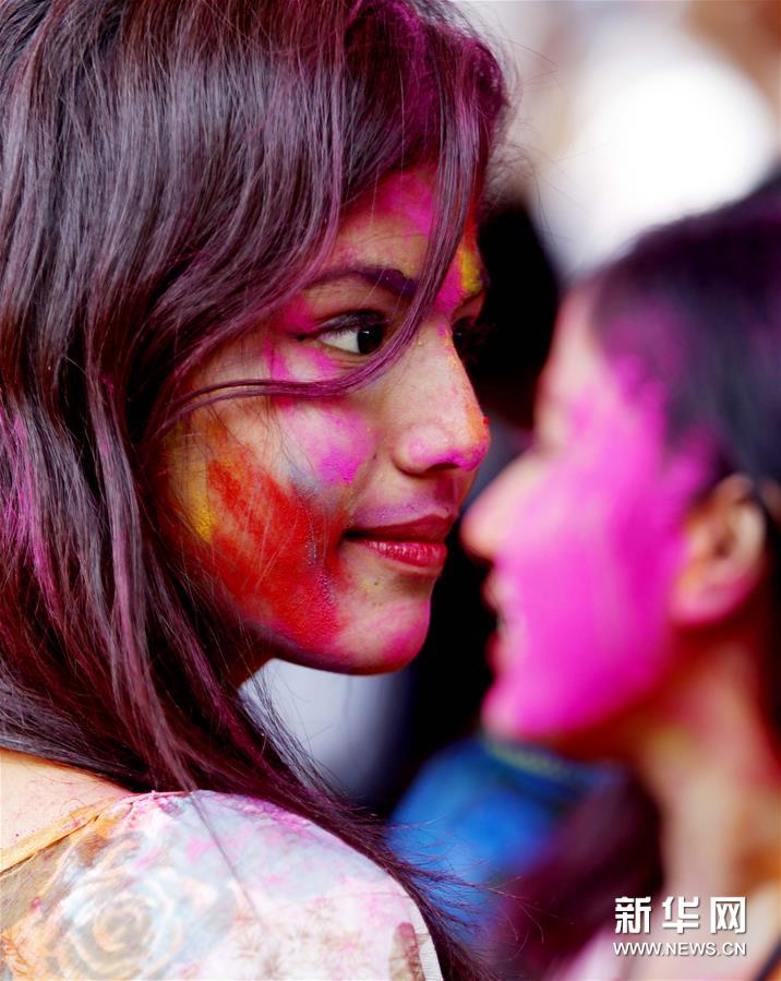 胡里節(jié)也叫“灑紅節(jié)”,人們?cè)谧约耗樕虾蜕砩贤可项伭希€向別人拋撒五顏六色的顏料和粉末,迎接春天的到來。新華社發(fā)(吳昂 攝)